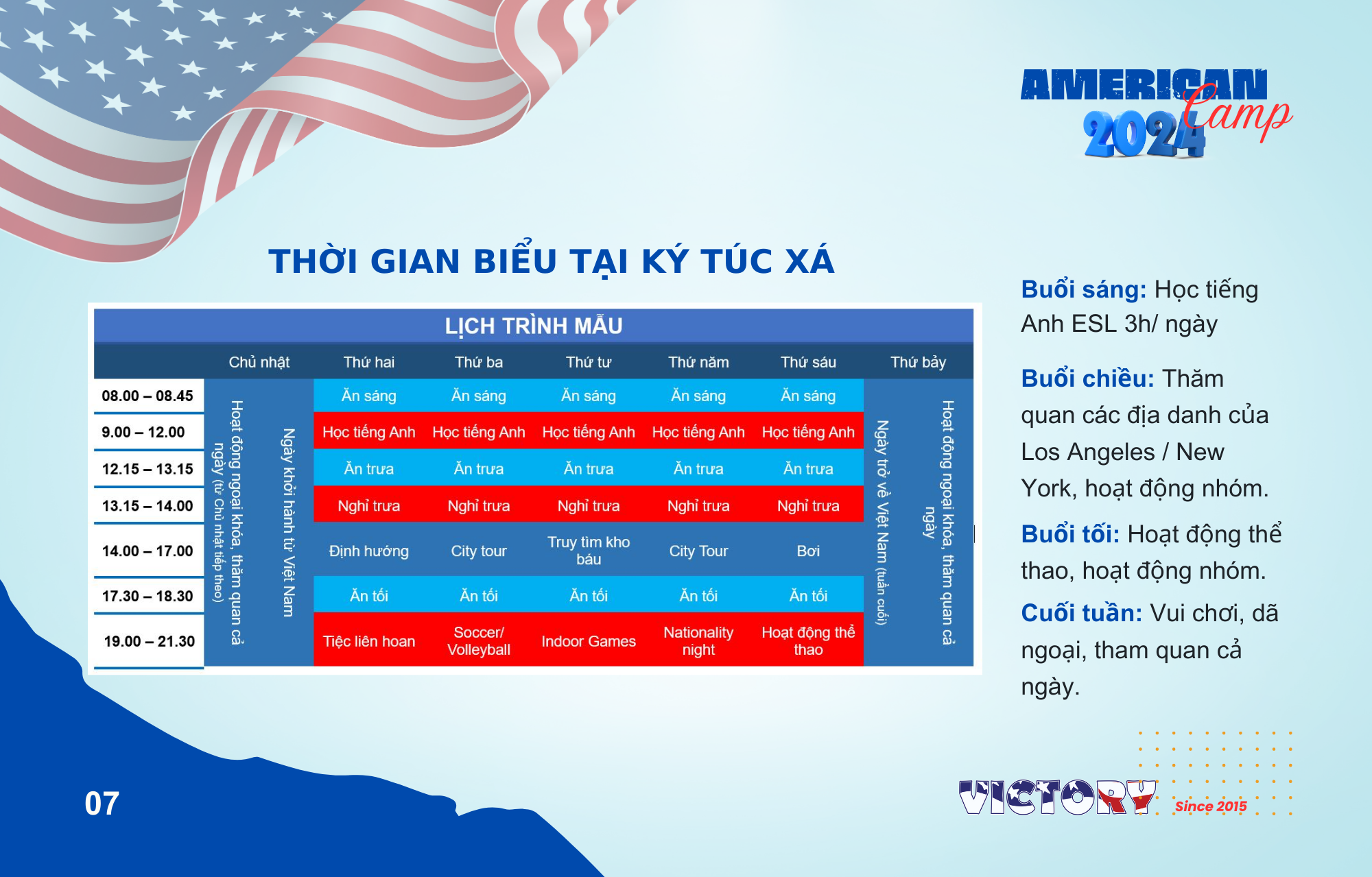 Trải qua 2-3 tuần cùng với chương trình Du học Hè Mỹ Victory, các em sẽ được thử nghiệm cuộc sống của một du học sinh Mỹ khi vừa đi khám phá thắng cảnh đất nước của tự do, ôn luyện các kỹ năng tiếng Anh tại nơi bản xứ và phát triển những kỹ năng mềm cần có cho tương lai. Ban tổ chức đã sắp xếp một lịch trình bận rộn những cũng rất cân bằng, vừa để cho các bạn không chểnh mảng học tập, cũng vừa để cho khoảng thời gian trải nghiệm tại Trại Hè Mỹ không quá căng thẳng, buồn chán cho các bạn học sinh bao gồm: 3 tiếng buổi sáng học tiếng Anh, hoạt động nhóm và đi tham quan vào buổi chiều, hoạt động thể thao vào buổi tối và đi dã ngoại cả ngày cuối tuần.
